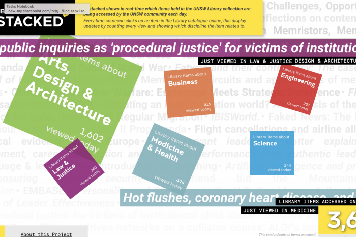 UNSW Library Unstacked displays and interprets usage of the UNSW Library collection in real-time, communicating the scale, breadth and depth of library research activity that is otherwise is invisible. The innovating intersection of data, visual communication and library science is a collaborative between UNSW Library and the Unstacked team led by Elisa Lee.